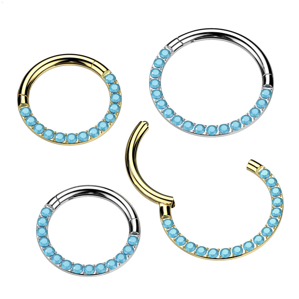 Check out our Implant Grade Titanium Aqua CZ Gems Pave Hinged Clicker Hoop. Made with the highest quality implant grade titanium, this hinged hoop is perfect for septum or daith piercings! The hoop features an easy hinged opening making it easy to use.