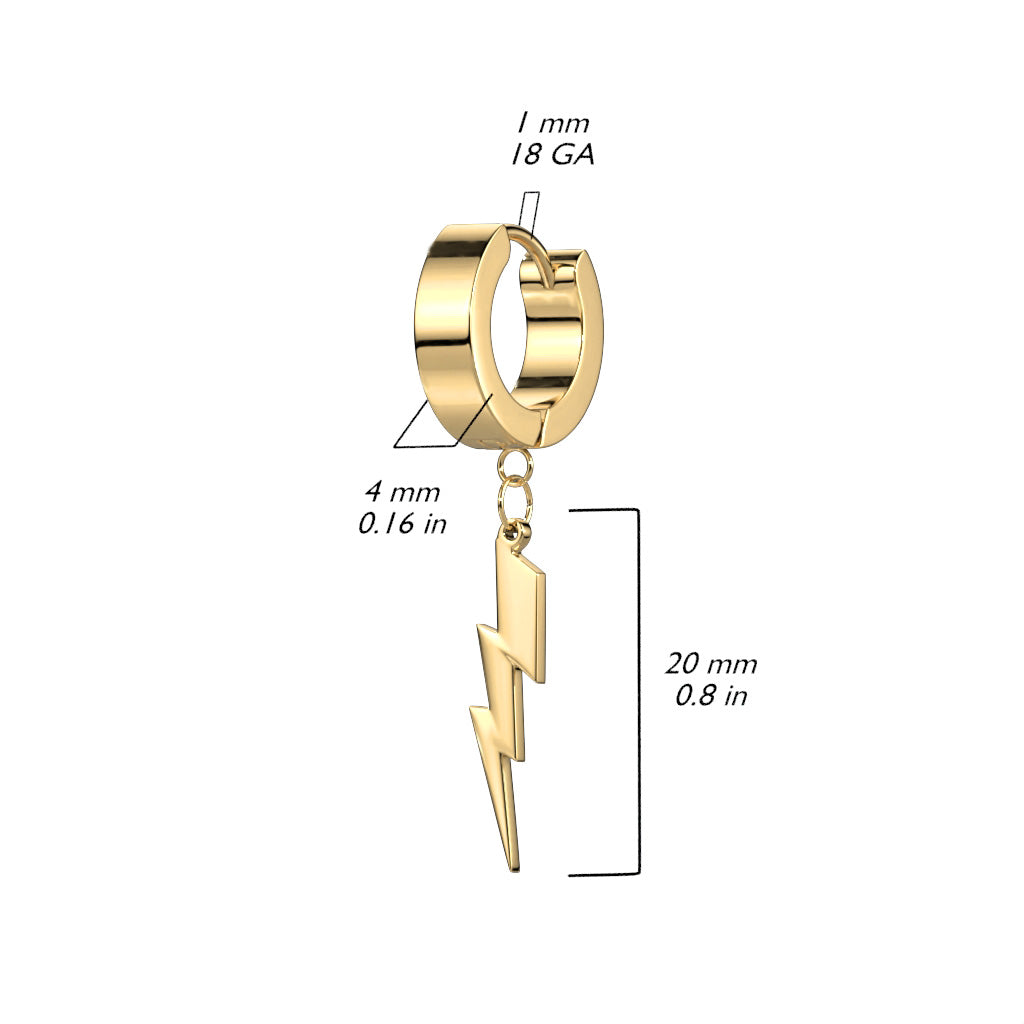 These 316L Surgical Steel Lightning Bolt Dangle Earrings feature a 20mm long lightning bolt dangle design and an easy hinged hoop closure.