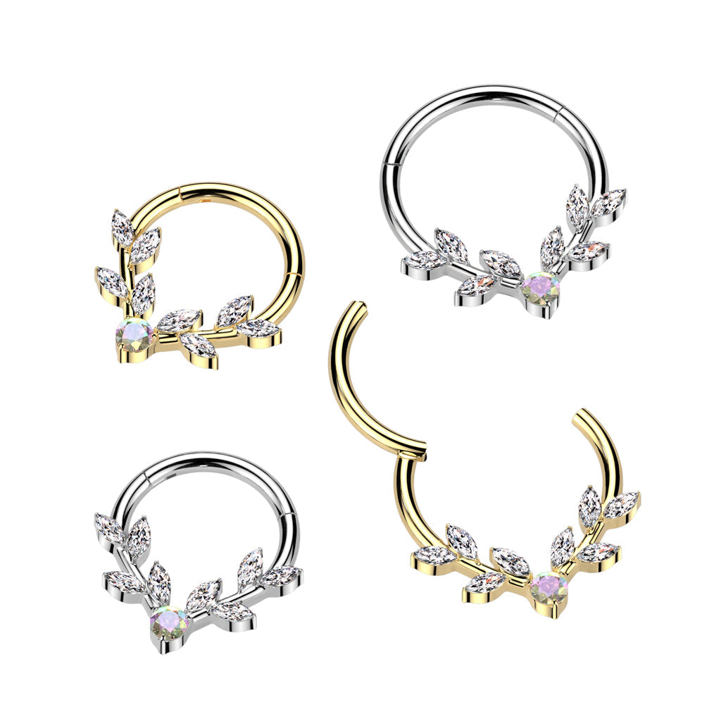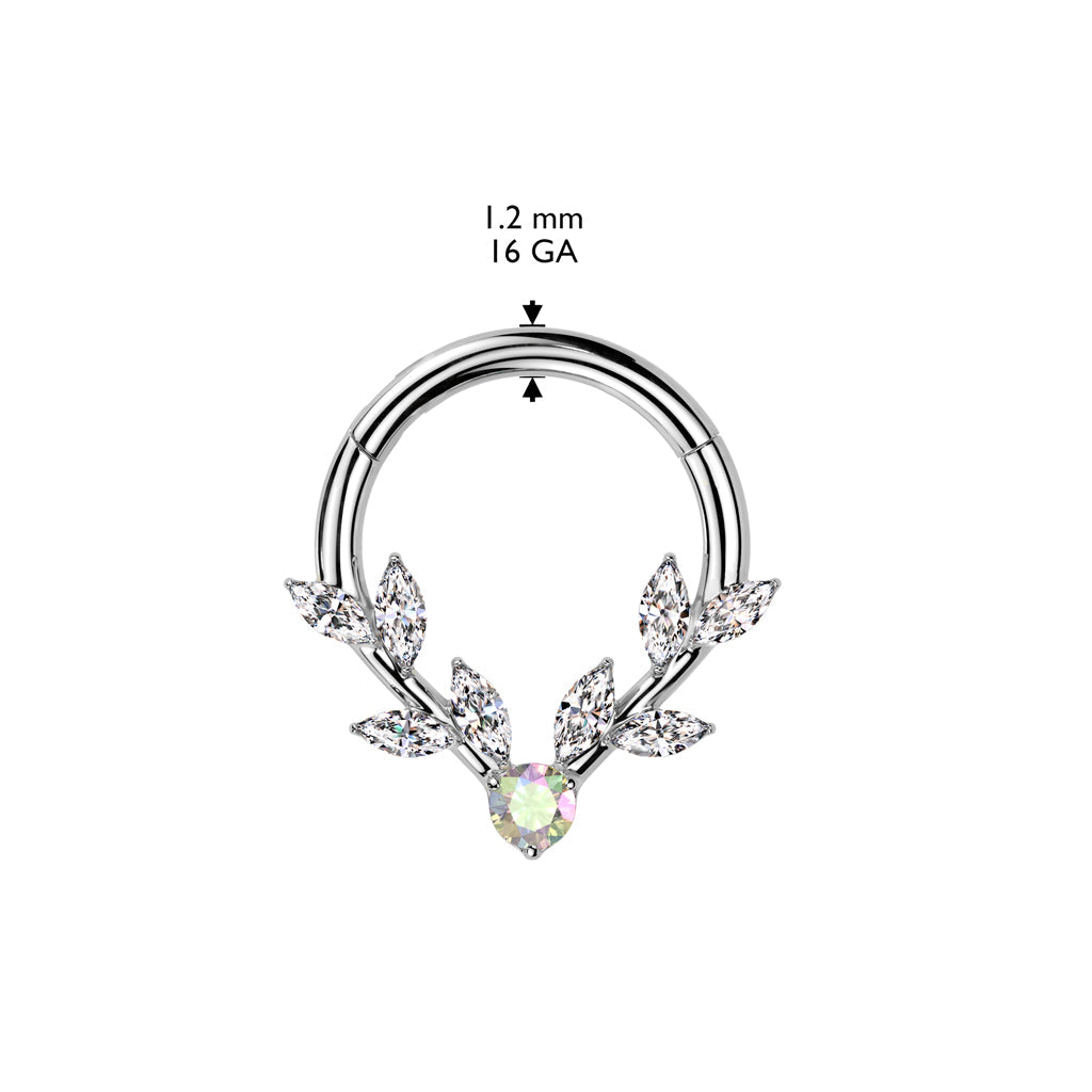 This 316L Surgical Steel White CZ Vine Hinged V Shaped Clicker Hoop is ideal for septum piercings. The intricate leaf vine design is enhanced by the aurora borealis CZ center gem, and the effortless hinged closure allows for comfortable wear.